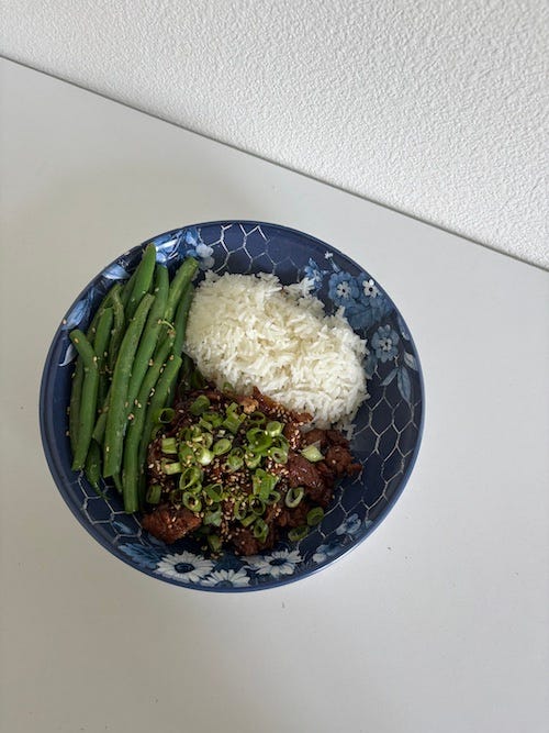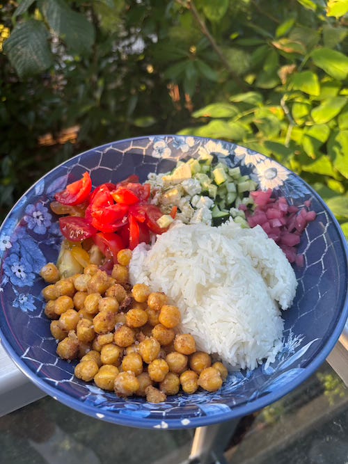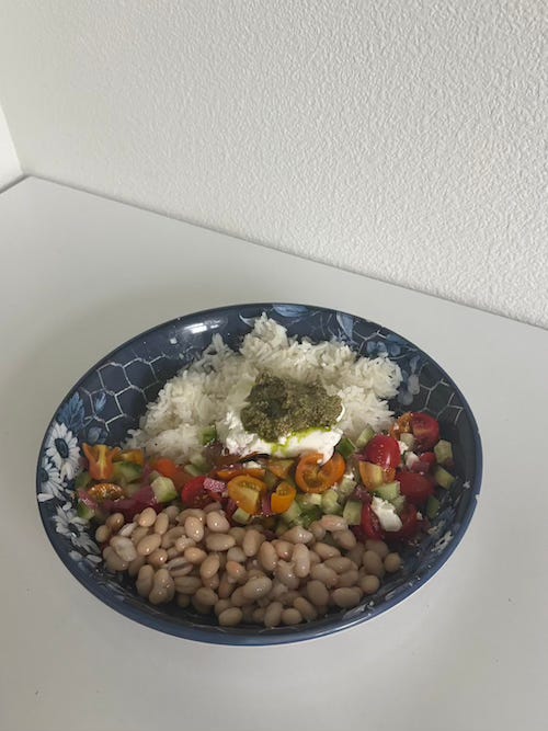 I started the month strong with more Cava-inspired bowls with rice, tomato, cucumber, pickled red onions, Greek yogurt, and feta. Usually, I go for chickpeas, but one week I only had white beans, and it was a revelation. I also made a big batch of cashew pesto, which was a nice addition.