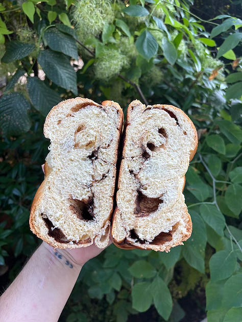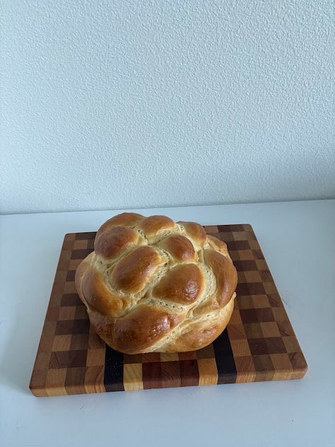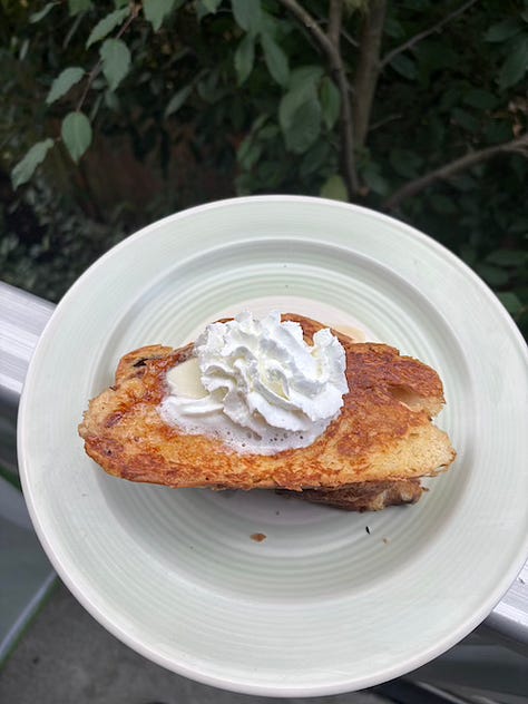 I made two sourdough challahs for Rosh Hashanah, one plain and one chocolate. I used the chocolate loaf to make French toast.