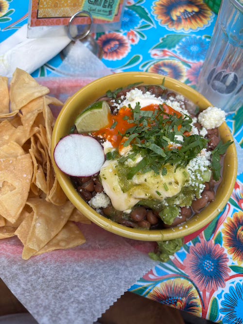 The three of us also went to Por Que No, which has a huge back patio, and was perfect for a warm but not hot evening. I love that their rice and bean bowl comes with chips!